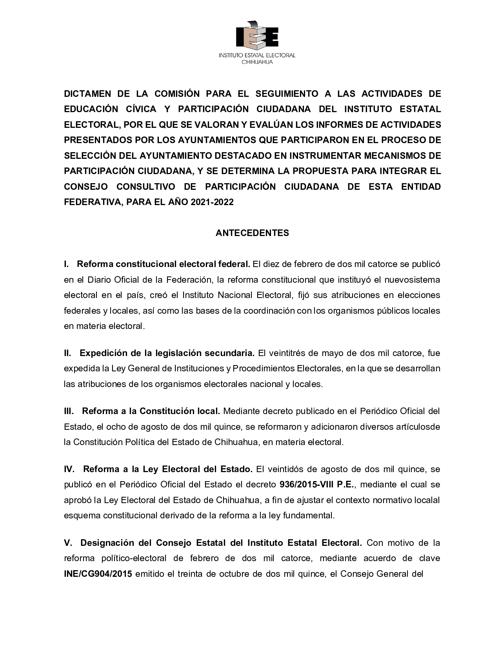El Instituto Estatal Electoral de Chihuahua (IEE) invita a los Ayuntamientos que deseen participar en la Convocatoria de Ayuntamiento Destacado 2024, con el propósito de seleccionar al Ayuntamiento que se haya destacado en instrumentar mecanismos de participación ciudadana y que tenga interés en integrarse al Consejo Consultivo de Participación Ciudadana que establece la Ley de Participación Ciudadana del Estado de Chihuahua con fundamento en lo dispuesto en el artículo 9 de la Ley de Participación Ciudadana del Estado de Chihuahua y 18 del Reglamento de la citada Ley. El Ayuntamiento Destacado será elegido de entre los ayuntamientos que participen en el procedimiento de selección, conforme a la convocatoria que para tal efecto emite el IEE y que se reproduce arriba en este sitio, bajo los siguientes elementos de evaluación:
