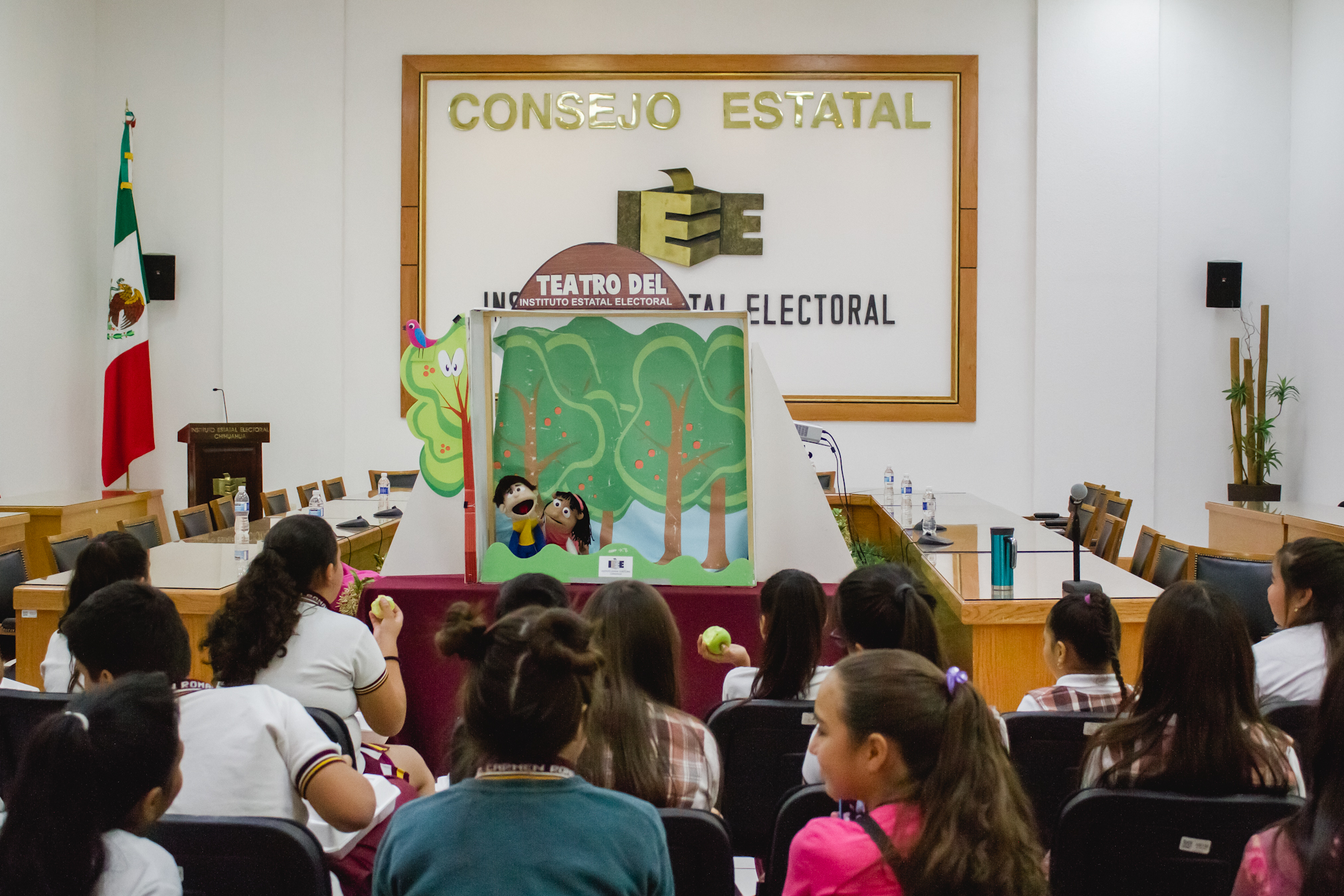 Al término del proceso de insaculación, niñas y niños disfrutaron de la obra de teatro guiñol del IEE, “La Unión Hace la Fuerza”, con sus divertidos personajes Tomasillo, Isabel, el Gallo Cloqui y el Lobo Cachafaz.